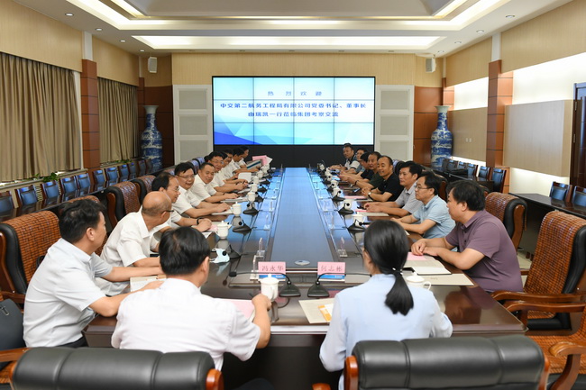 8月11日上午,中交第二航务工程局有限公司党委书记、董事长由瑞凯,总会计师周露、副总经理薛安青等一行12人来集团考察交流。集团党委书记、董事长汤继沂,副总经理田国锋、宫庆华、马烽以及相关单位负责人等在四楼会议室参加座谈交流。