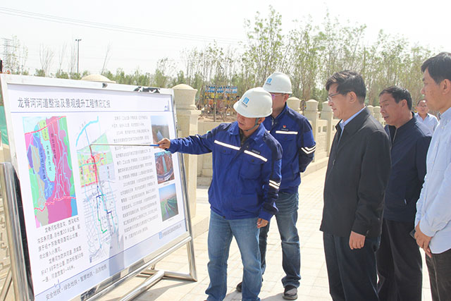 5月13日,济南市委常委、市总工会主席雷天太察看集团承建的龙脊河项目,济南轨道交通集团副总经理潘军等陪同。