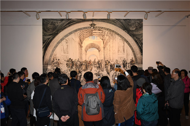 此次展览非常独特,只展出一幅作品,该作是韦辛夷先生历时一年半创作的巨幅中国画《吾问西东》。意大利艺术巨匠拉斐尔的《雅典学院》名闻遐迩,而此次韦辛夷先生以中国笔墨重构了这幅经典巨作,他用一幅画呈现了世界文明史上辉煌的“轴心时代”:一幅画,让人思接千载;一幅画,东西方大师相会;一幅画,构建新笔墨情怀。创作过程中的工作照、记者访谈、创作草图和相关资料也同时展出,一幅画的展览,内容却很丰富,不少观众在展厅内流连忘返。