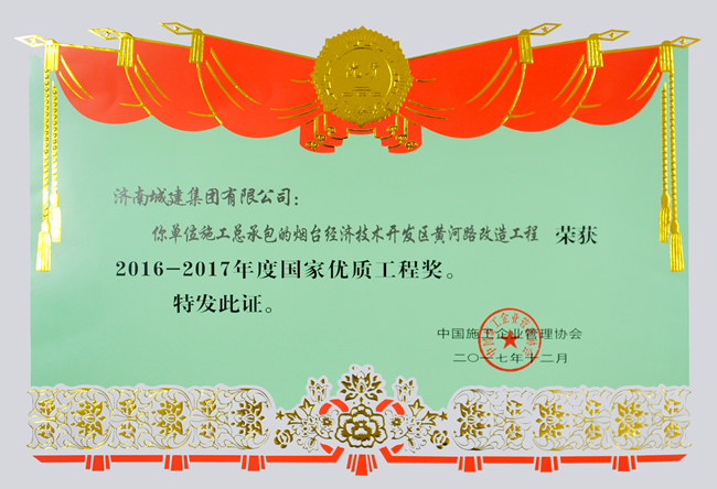 集团施工总承包的烟台经济开发区黄河路改造工程被授予“国家优质工程奖”。国家优质工程奖设立于1981年,是工程建设领域设立最早、规格最高,跨行业、跨专业的国家级荣誉奖励,旨在弘扬“追求卓越,铸就经典”的国优精神,充分发挥示范引领作用,大力推进质量强国建设,是我国工程建设质量方面的最高荣誉。
