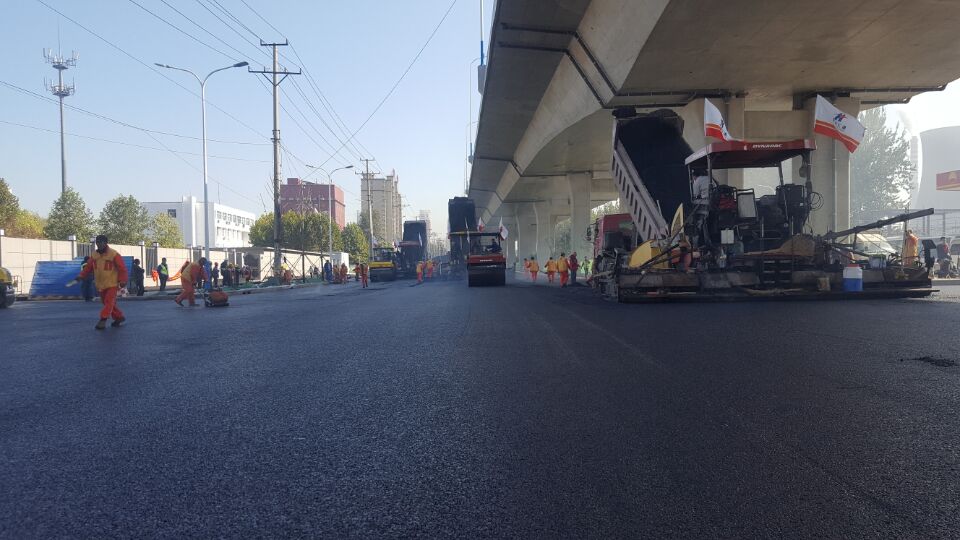 此次道路摊铺全长8.3公里,面积34.5万平方,混合料重量约3.5万吨,现场6台摊铺机、5台大型压路机、3台小型压路机联机作业,调集分公司在济全部摊铺队伍全力以赴投入施工。按照自西向东摊铺的顺序,分阶段、分区域进行半幅施工,半幅双向通行,同时借用部分非机动车道进行车辆分流,克服交通压力大的困难。第一阶段预计5天时间完成二标段(全福立交区至奥体中路)摊铺施工,第二阶段展开三标、四标沥青摊铺,预计5天完成,计划11月2日全部完成地面道路沥青上面层摊铺。此道工序完成后,工业北路快速路建设工程全线通车在即。