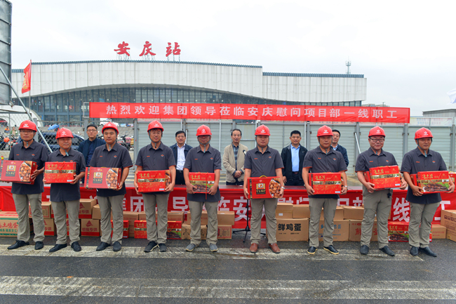 10月4日,安庆的中秋丹桂飘香,迎宾西路工地彩旗招展。集团党委书记、董事长汤继沂带领副总经理史红军,纪委书记王维锋,工会主席、总经济师朱相波,副总经理王翔以及相关部室、分公司负责人来到集团安庆地区项目部,对节日期间依然奋战在施工一线的项目部全体干部职工进行节日慰问。