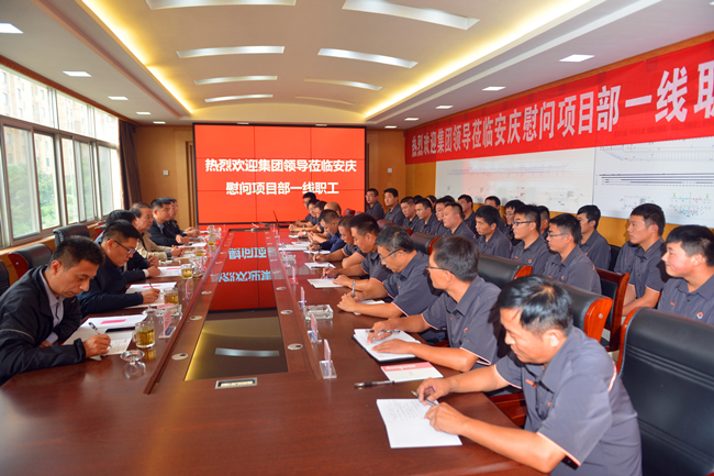 会上,汤继沂董事长一行认真听取了安庆地区工程管理和团队建设情况汇报,并就外埠施工、职工生活、学习等方面与项目部职工进行了亲切交谈。