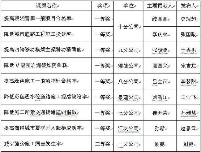 中国市政工程协会授予集团“全国市政工程建设QC小组活动优秀企业”,九分公司张俊鲁被评为“全国市政工程建设QC小组活动优秀推进者”。