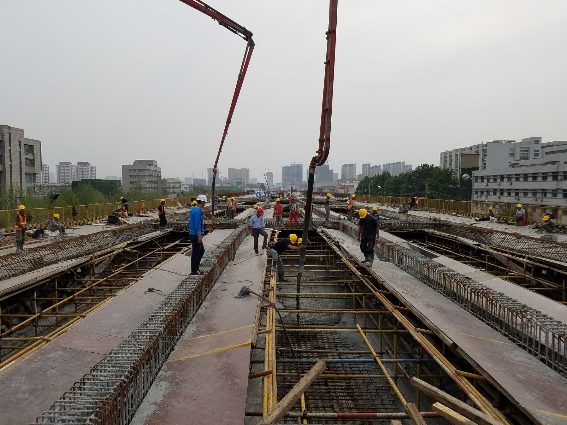 为确保高架箱梁砼浇筑的顺利进行,项目部领导高度重视,提前谋划,浇筑前召开箱梁交底会议,研究优化浇筑方案,安全技术交底到班组、个人。施工过程中,3联箱梁受4道220KV超高压的影响,无法正常施工,项目部主动联系电力部门,制定安全防护方案,在保证安全的前提下,合理安排施工工序,确保停电后达到立即形成砼浇筑条件,将影响降到最低。