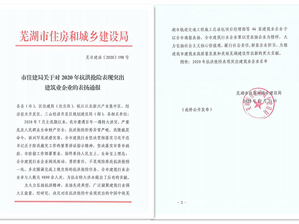 近日,芜湖市住房和城乡建设局对46家在抗洪抢险中表现突出的建筑业企业予以通报表扬,集团名列榜单。