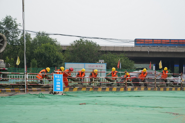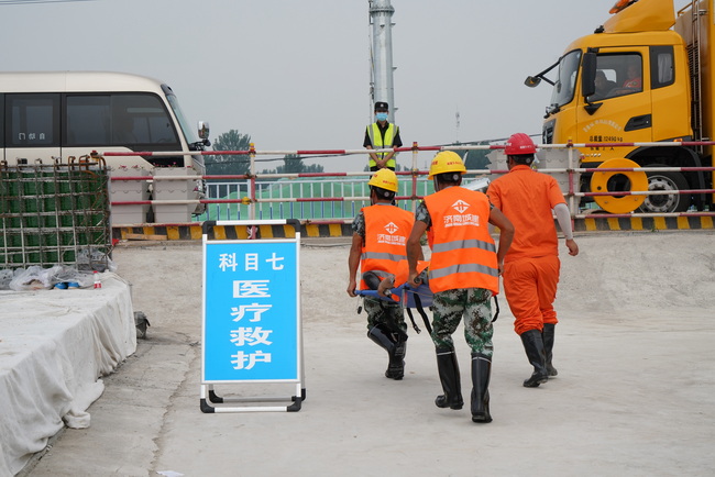 此次演练模拟济南市起步区黄河大道连日来普降大到暴雨,黄河大道一期工程三标段周边水位迅速上涨,已基本与基坑围堰持平,严重危及作业人员和设备安全的场景。防汛演练共进行了疏通两侧排水沟、沙袋围堰、临时用电、水泵排水、人员疏散、交通封闭、医疗救护、汛中上报、汛后回复、调拨新型排水车排水等10个科目的内容,演练参与人员100余人。