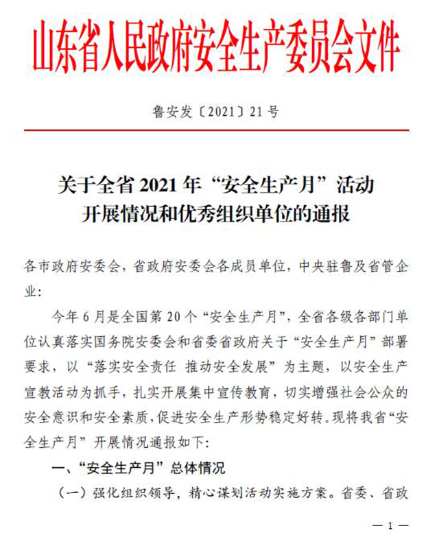 集团荣获全省2021年“安全生产月”活动优秀组织单位