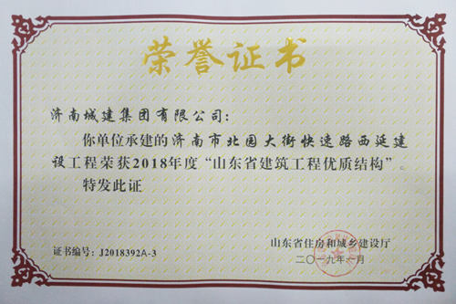 济南市北园大街快速路西延建设工程被评为2018年度“山东省建筑工程优质结构”