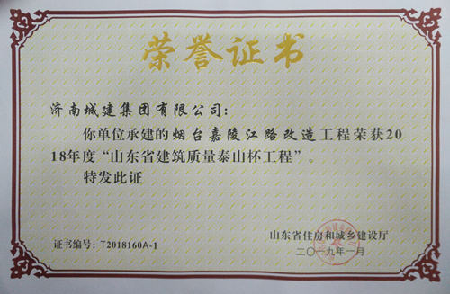 烟台嘉陵江路改造工程被评为2018年度“山东省建筑质量泰山杯工程”
