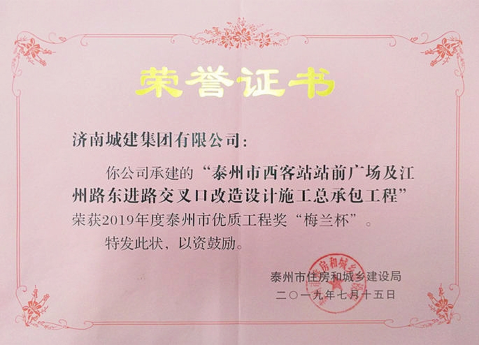 泰州市西客站站前广场及江州东进路交叉口改造设计施工总承包工程被评为2019年度泰州市优质工程奖”梅兰杯“