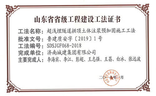 集团“超浅埋隧道拱顶土体注浆预加固施工工法”被评为山东省省级工程建设工法