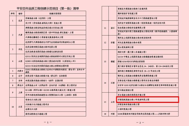 国家交通运输部发布了《交通运输部办公厅关于公布平安百年品质工程创建示范项目(第一批)清单的通知》(交办安监函〔2021〕932号),集团承建的济南绕城高速公路二环线西环段工程荣获“平安百年品质工程创建示范项目”。