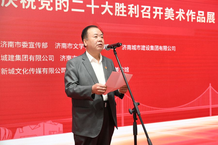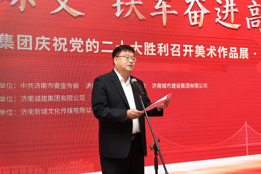 济南市文联党组书记、副主席刘浩在讲话中表示,本次展览是我市近年来组织举办的层次较高、质量较好、艺术性较强的一次大型综合美术作品展。展出的作品秉持以人民为中心的创作立场,集思想性、艺术性和时代性为一体,主题鲜明,艺术精湛,内容丰富。展览尤其浓墨重彩展现了“城建铁军”队伍在推动济南由“大明湖时代”迈向“黄河时代”的历史进程中履行国企担当、勇于攻坚克难的新时代风采,生动展示了锦绣泉城十年蝶变、高质量发展的新时代风貌。