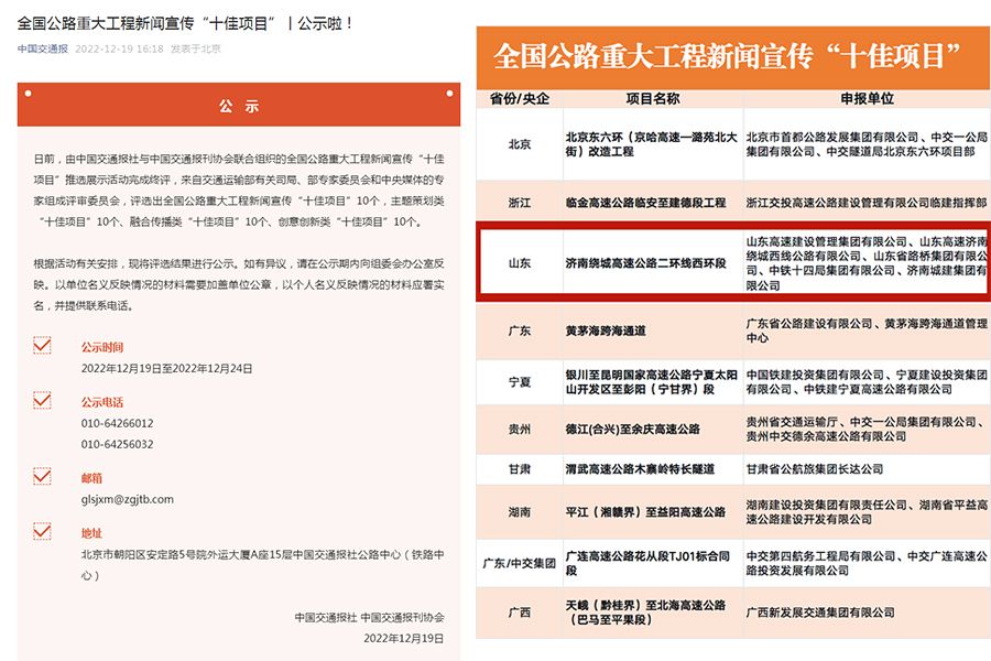 近日,集团济南绕城高速公路二环线西环段项目成功入选“全国公路重大工程新闻宣传十佳项目”。