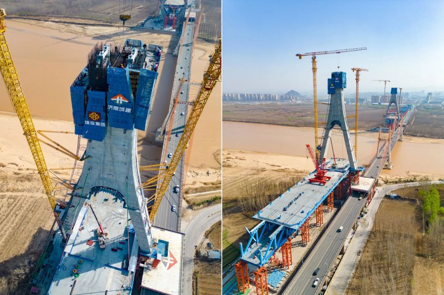 目前,该项目黄河大桥主桥下部结构施工完成,主桥主塔总高度168.6米,已施工至156.3米,即将封顶;钢桁梁架设完成50%;零点立交济南西岗收费站及跨将军路南侧匝道桥拆除完成,正在进行新建匝道现浇箱梁施工。
